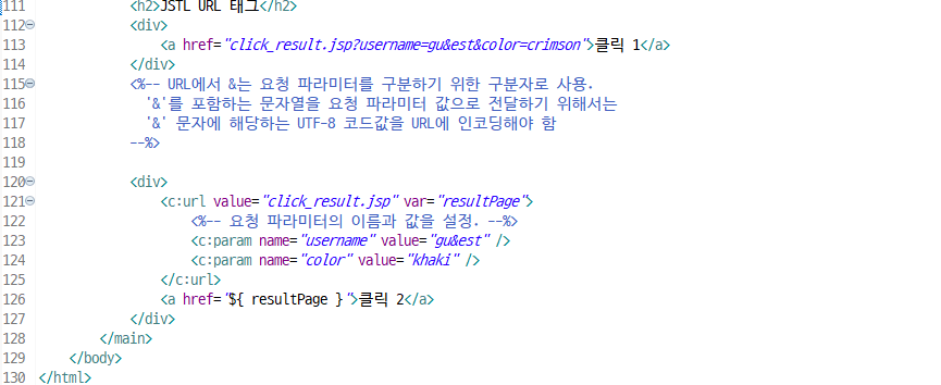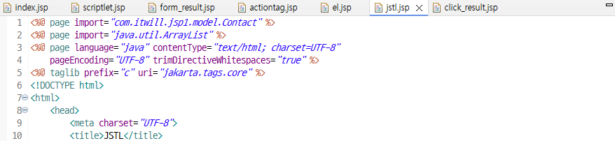 JSTL이 나오게된 배경..JSP 태그만 사용해서 표현하는 방법에도 한계가 있었음.HTML태그들은 스크립트릿 안에 들어갈 수 없다는 것. 작성하기에 불편하고, 가독성도 떨어지는 이런 한계를 극복하기 위해 만들어진 것이 JSTL.