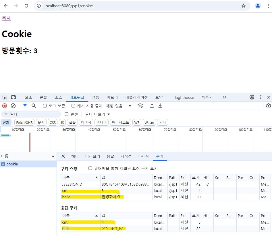 * Tomcat 에서는 localhost:8080으로 접속하면 JSESSIONID 라는 쿠키를 만들어서 보낸다.