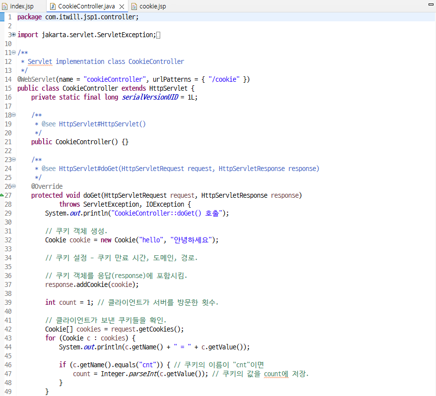 - 연결 상태를 유지하기 위해 사용하는 방법: (1) 쿠키 (2) 세션