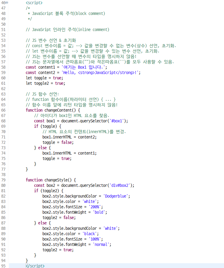 1. HTML 요소 찾는 법 1) document.querySelector()(1) 아규먼트는 항상 문자열 타입.(2) CSS의 selector 형식(태그, 클래스, 아이디)을 아규먼트로 사용할 수 있음. 2) document.getElementById()(1) 아규먼트는 아이디 이름을 입력(#은 생략) 3) document.getElementsByClassName()(1) 아규먼트는 클래스 이름을 입력( .은 생략) 4) document.getElementsByTagName()(1) 아규먼트는 태그 이름을 입력 5) document.querySelector()와 document.getElementById() 메서드는 코드 제일 처음부터 순서대로 아이디를 찾기 시작해서 제일 먼저 발견되는 아이디의 요소..
